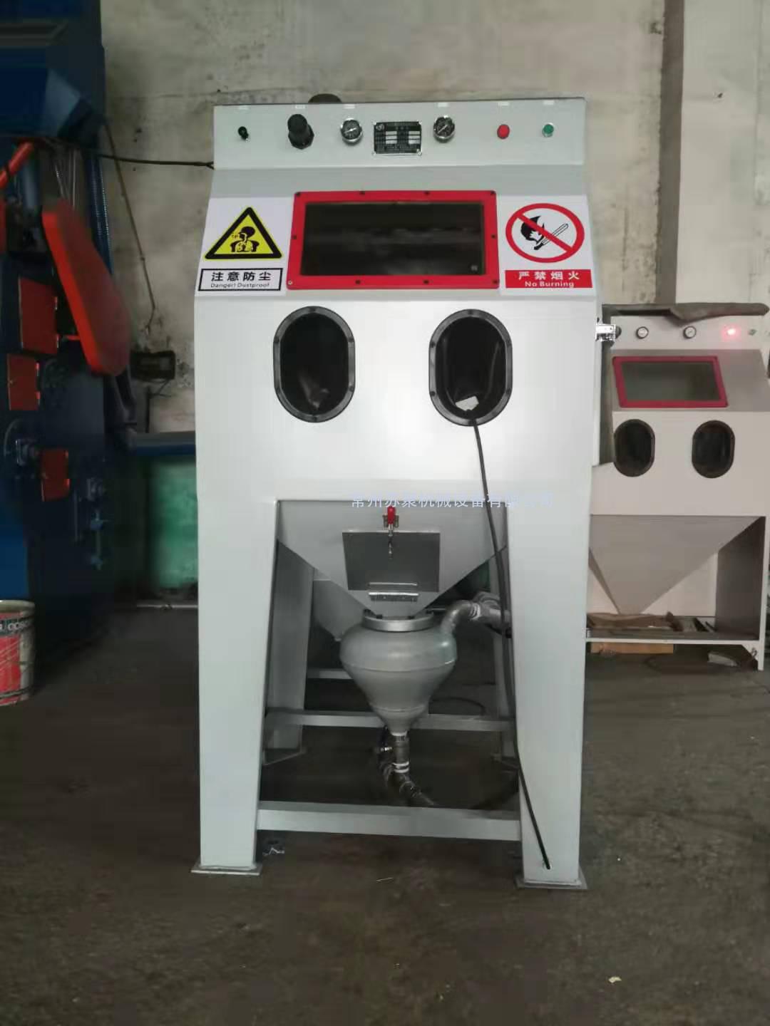 2、加裝活動臺車和轉(zhuǎn)盤,操作時僅需將工件放在臺車轉(zhuǎn)盤上,然后將推噴砂機入機內(nèi)即可從事噴砂作業(yè),十分簡單省力,可加裝定時加熱器防止玻璃珠受潮。