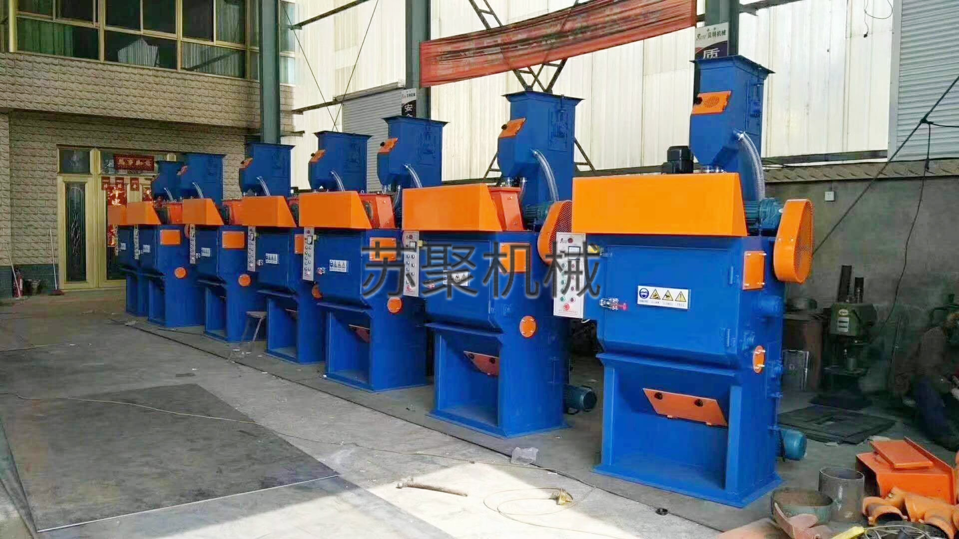 在清理室中加入規(guī)定數(shù)量的工件,機(jī)器啟動后,滾筒開始旋轉(zhuǎn),被清理的工件由橡膠履帶帶動在滾筒內(nèi)作連續(xù)均勻的翻轉(zhuǎn),同時(shí)拋丸器高效